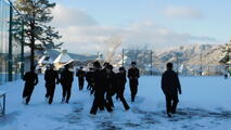 いよいよ本格的な冬の到来。真っ白に輝く校舎の周りをJRC委員を