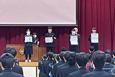 1月23日(木)の全校朝会のはじめに表彰式を行いました。