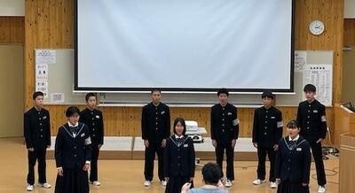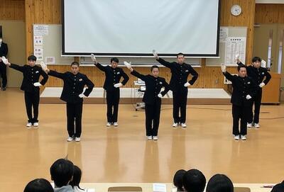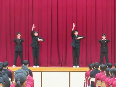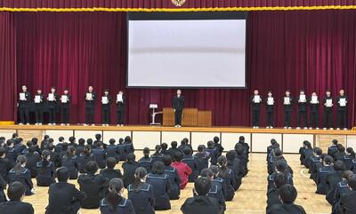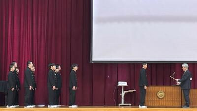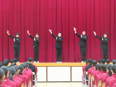 令和7年2月6日の全校朝会で、新応援団リーダーの認証式を行いました。