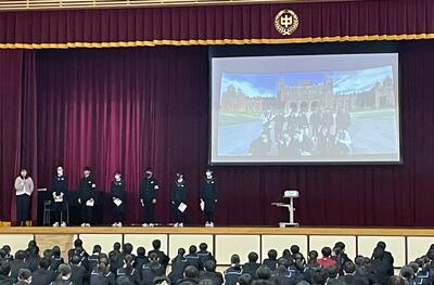 1月30日(木)の全校朝会で、海外派遣に参加した6名の報告会がありました。