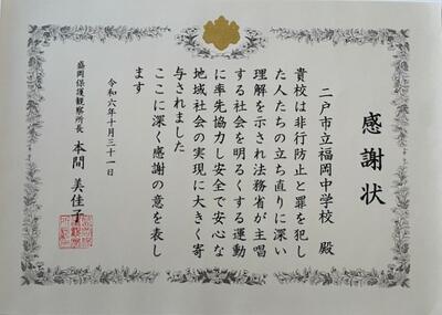 10月31日(木)「岩手県更生保護研究大会」と11月1日(金)「いわて教育の日のつどい」の2日連続で、福岡中学校と福岡中学校PTAが表彰されました。